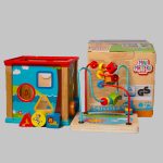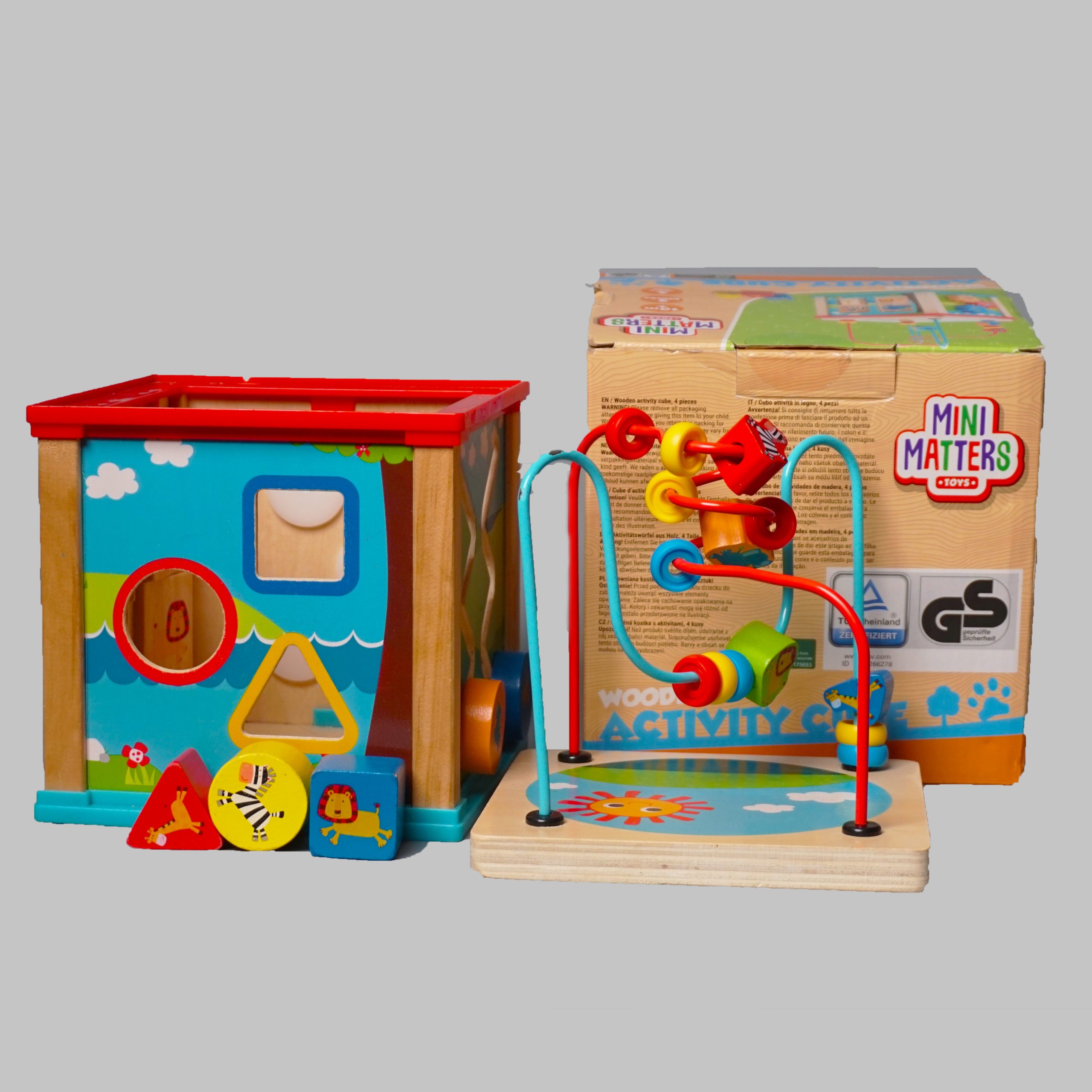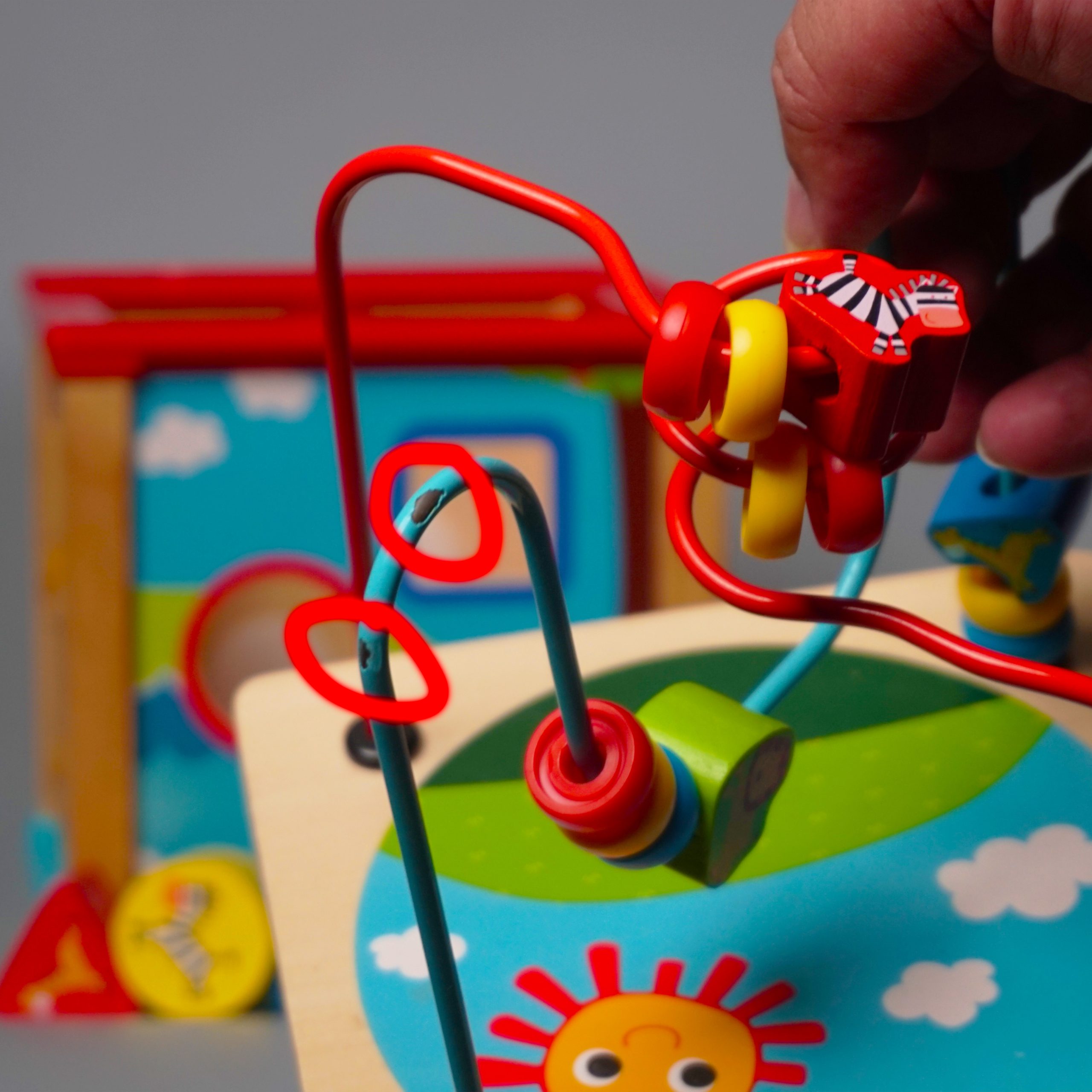 Chacune des faces de ce cube accueille un jeu de motricité pour perfectionner la dextérité : un circuit de motricité avec perles, un jeu d’encastrement de formes, un jeu d’engrenages